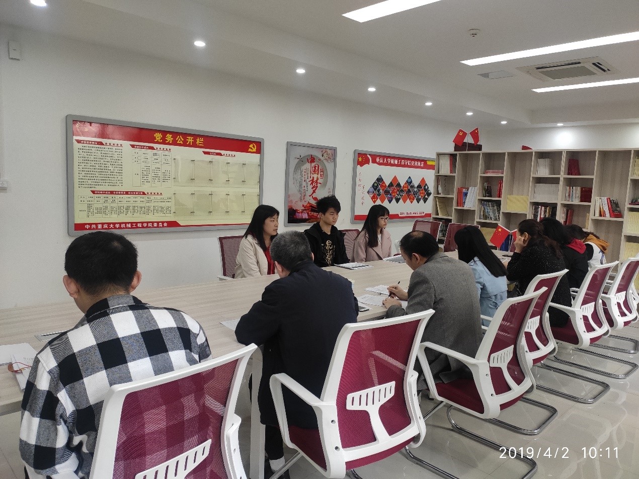 2019年4月3日上午10:00,2019年重庆市优秀毕业研究生推选工作面试环节在7教304顺利开展,本次面试由学院党委副书记樊玮主持,副院长、博士生导师汤宝平教授、纪委委员、博士生导师林超教授和学工办主任杨联星以及研究生辅导员崔学芳、张建坤担任评委,2016级研究生李鑫鑫作为学生代表参会。经过前期自愿申报,共有8人参加面试。