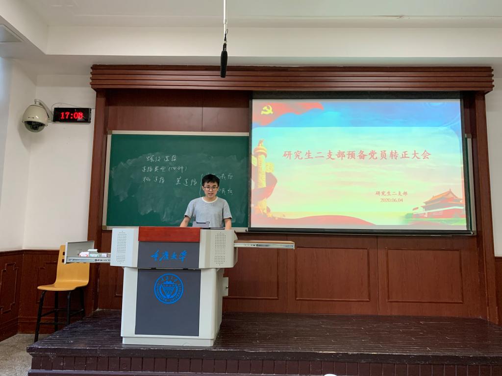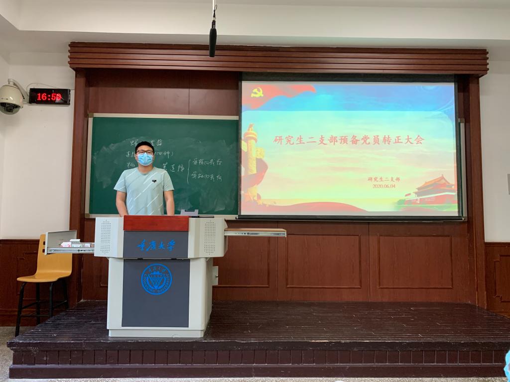 2020年6月4日16:30,机械工程学院研究生二支部在重庆大学A区A5102教室开展了“聚焦2020全国两会”主题党日活动和石昊、李彪、焦喜振同志的转正活动,会议主要内容为三个部分,第一部分,通过PPT讲解学习全国两会的相关信息;第二部分,为深入理解全国两会,观看中央新闻短片《就业是最大的民生》 ;第三部分,对石昊、李彪、焦喜振三位同志预备期以来的表现进行考察,表决三位同志能否如期转正。