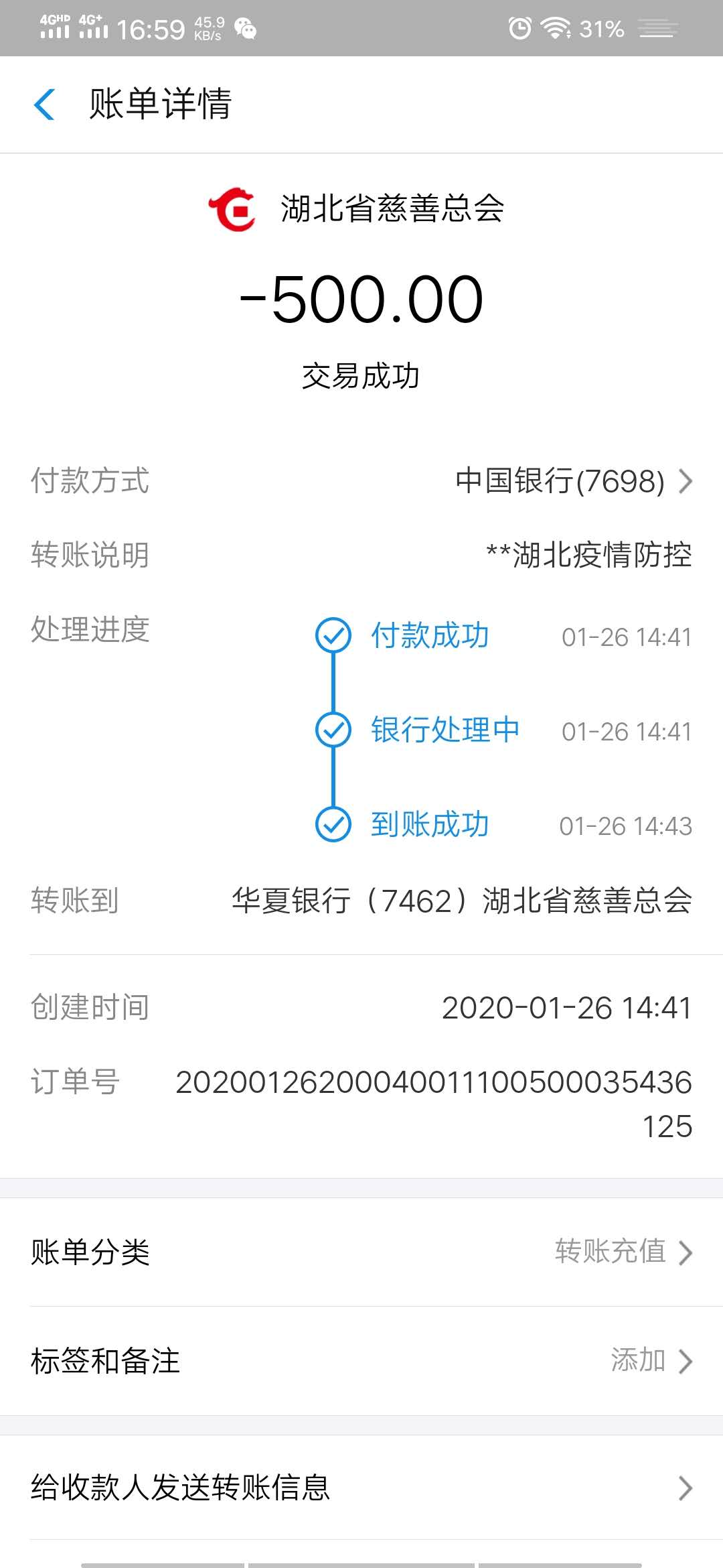 除了在疫情抗击中出力之外,我院学子也积极捐献物资。2016级机械设计制造及其自动化专业实验班学生黄雪峰,和家人一起购买了100桶消毒液,准备待学校开学了捐给家乡的学校。2016级机械设计制造及其自动化专业10班学生杨峰,将自己的部分“压岁钱”捐给了湖北省慈善总会。