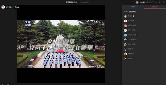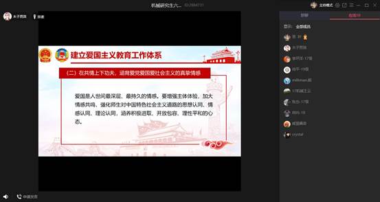2020年4月10日下午2:30,在党支部书记张建坤老师和副书记谌登叶的组织下,机械学院研究生六支部以QQ群网络视频会议的方式开展了本次关于学习宣传贯彻落实《新时代爱国主义教育实施纲要》的工作方案,会上还回顾了国内外疫情发展概况。
