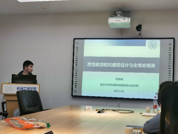 何海风以“高性能齿轮疲劳设计与全寿命预测”为主题展开了分享。他以齿轮、轴承等基础件的重要性的研究背景开始,给大家介绍了高性能齿轮的重要性与发展趋势。他就高性能齿轮的疲劳寿命预测和基于连续损伤的齿轮疲劳裂纹萌生研究为主要内容介绍了自己的研究进展。最后他还提出了基于高性能齿轮全寿命预测来实现传动设备抗疲劳设计的展望,而且就这一展望给大家提出了一个小问题:全寿命预测为何有助于抗疲劳设计?