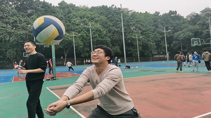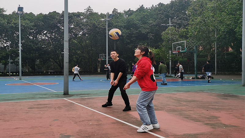 而后支部成员分为两组进行排球对抗赛。比赛开始后,两队成员个个精神抖擞、斗志昂扬、全力以赴,发球、垫球、传球、拦网、扣球等配合默契,排球时而在队员们手中来回传递,时而在空中飞来飞去,时而急速下坠,险象环生,扣人心弦,得分赢球的欢呼声及笑声不绝于耳,比赛高潮迭起。