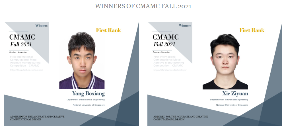 2021年11月,在新加坡国立大学(以下简称“新国大”)闫文韬教授的指导下,谢孜远与同为2020级新国大苏研院“3+1+1”项目机械工程专业(ME)的学生杨博翔组队参加CMAMC并取得冠军。CMAMC是通过计算方法解决问题的国际性竞赛,主办方为美国Manufacturing Technology公司,旨在实践和促进金属增材制造中的计算方法。本次比赛的选手来自10个国家,拥有不同的教育背景。其中研究生占总人数的60%,博士后与研究人员占35%,本科生占5%。