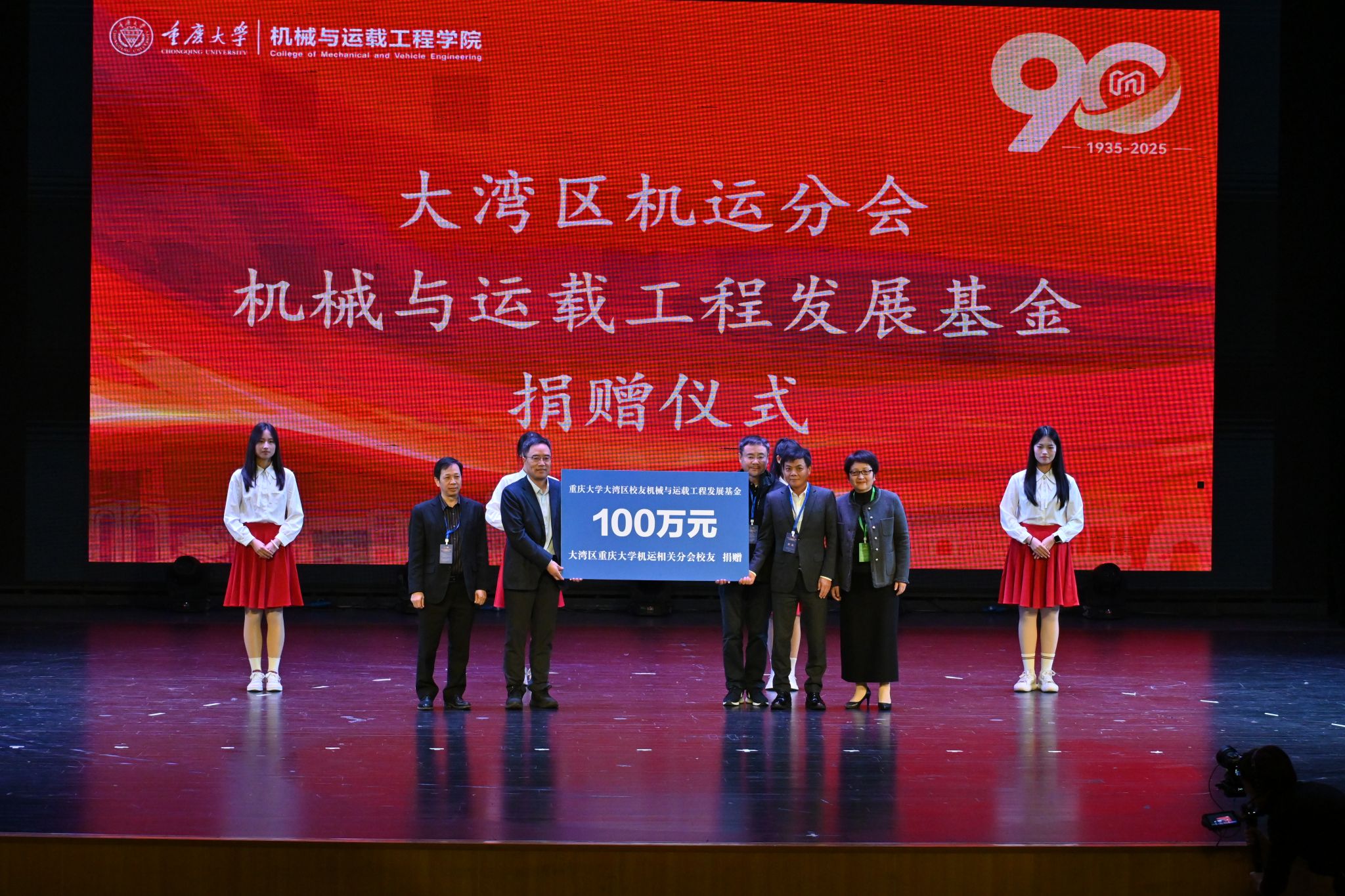 值此九十华诞,大湾区机运相关分会为学院捐赠发展基金,以实际行动支持学院建设,重庆大学教育发展基金会副秘书长廖元亮代表基金会接受捐赠牌。