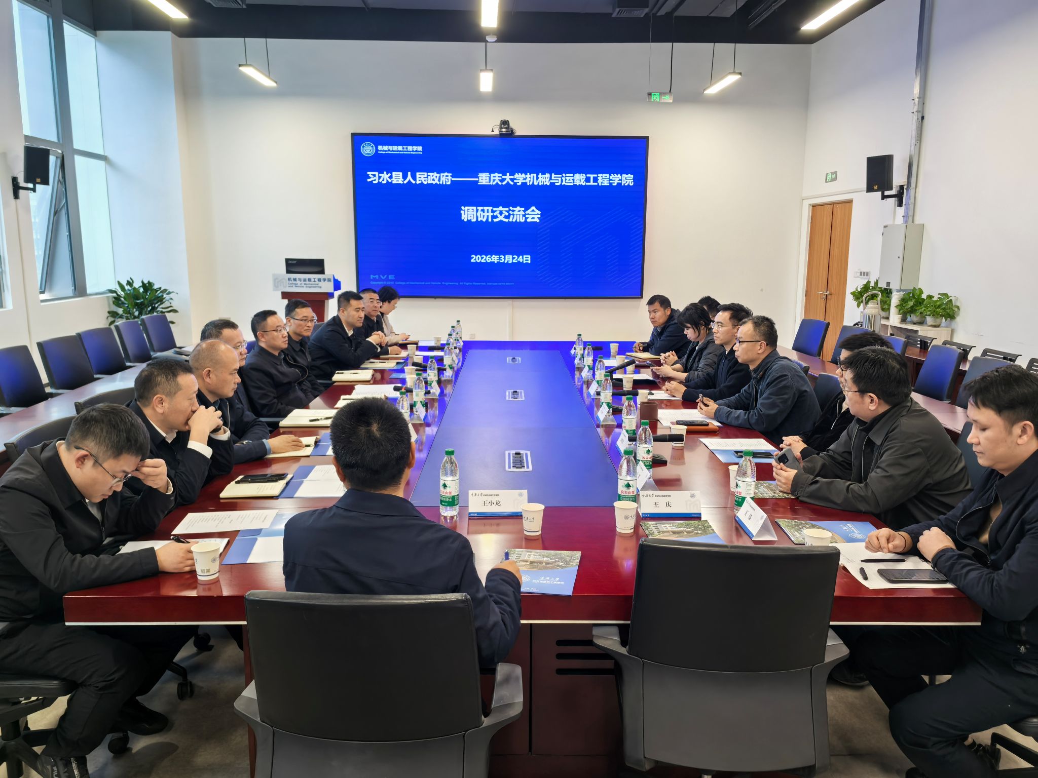 2026年3月24日下午,由贵州省习水县委副书记、县人民政府县长刘定杰带队,遵义市人民政府驻重庆(成都)办事处副主任任康,习水县人大副主任熊山,县人民政府副县长杨国东,县政协副主席倪军华,县人民政府办公室主任马江洪等一行11人到访重庆大学机械与运载工程学院,开展调研交流活动。机械与运载工程学院副院长褚志刚,副院长蒲华燕等出席座谈。会议由机械与运载工程学院党委副书记吴昊主持。