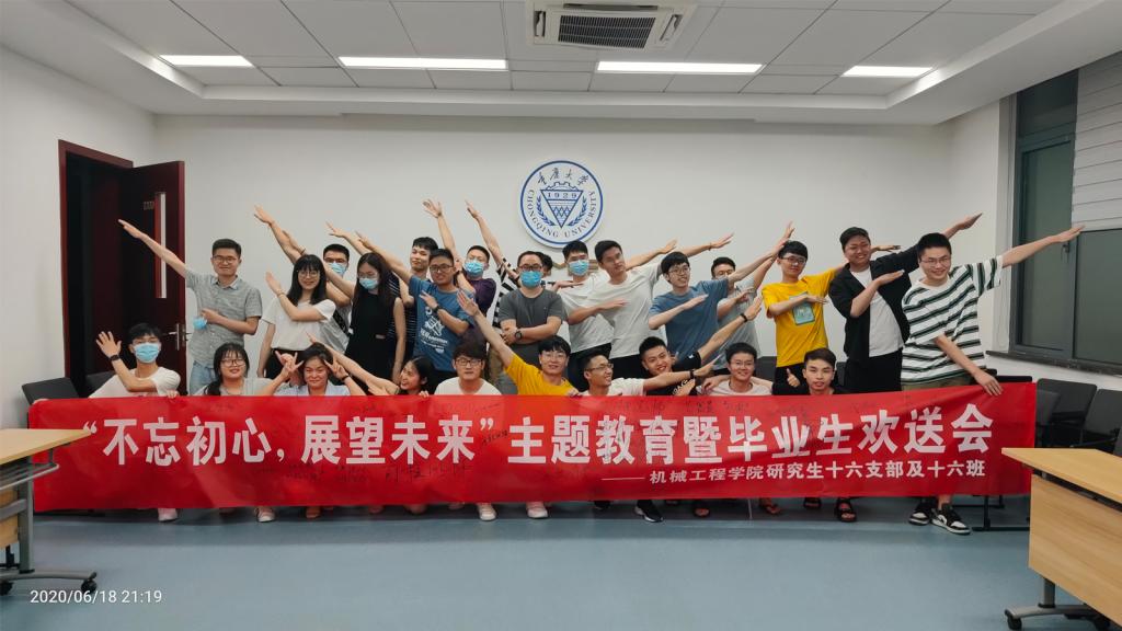 2020年6月18日晚7点,在机械工程学院研究生第十六党支部的组织下,研究生十六班在第七教学楼333会议室举行了“不忘初心、展望未来”主题教育暨毕业生欢送会的主题党日活动,活动由陈小敏和郑丰蕾主持。