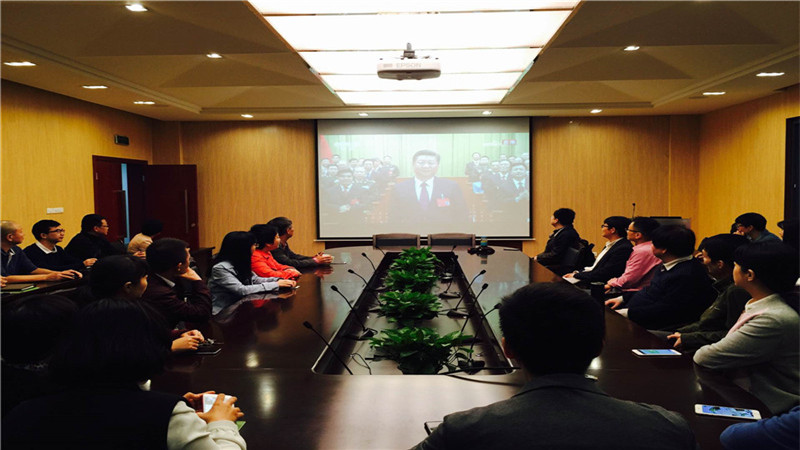 中国共产党第十九次全国代表大会开幕会于10月18日上午9:00在人民大会堂大礼堂举行。习近平总书记代表十八届中央委员会向大会作报告。机械工程学院党委书记王勇勤、副书记陈晓慧、樊玮、副院长罗远新、传动实验室副主任陶桂宝、邵一敏等领导及师生代表共计100余人共聚传动219会议室,喜迎十九大,共同观注十九大开幕式。会场气氛热烈,师生洋溢着喜悦的笑容。另外,在办公室、实验室,师生们也利用网络直播,共同收看开幕式,全院上下齐聚一心,共同感受习近平总书记的精彩报告!