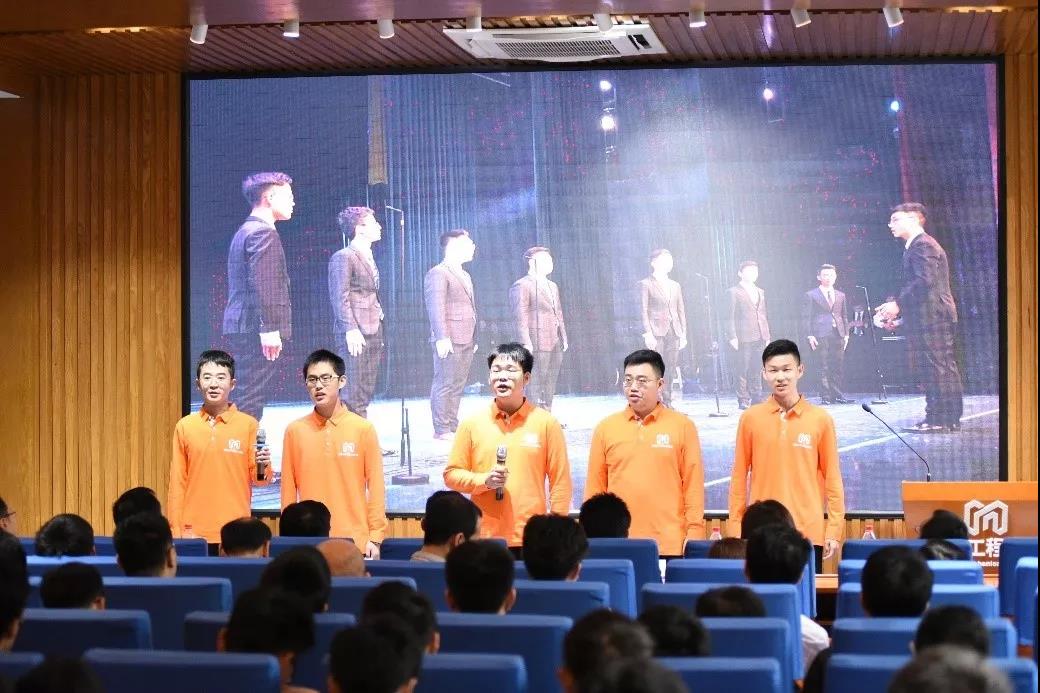 报告会期间,机械工程学院的同学们为校友带来了校园文化表演男声小合唱《万泉河水清又清》,优美的歌声让校友与在场师生们感受到了那革命时期军民团结一家亲的奋进力量。