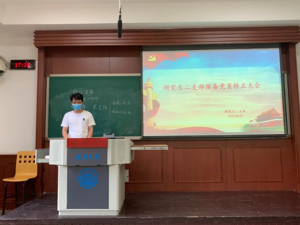 2020年6月4日16:30,机械工程学院研究生二支部在重庆大学A区A5102教室开展了“聚焦2020全国两会”主题党日活动和石昊、李彪、焦喜振同志的转正活动,会议主要内容为三个部分,第一部分,通过PPT讲解学习全国两会的相关信息;第二部分,为深入理解全国两会,观看中央新闻短片《就业是最大的民生》 ;第三部分,对石昊、李彪、焦喜振三位同志预备期以来的表现进行考察,表决三位同志能否如期转正。
