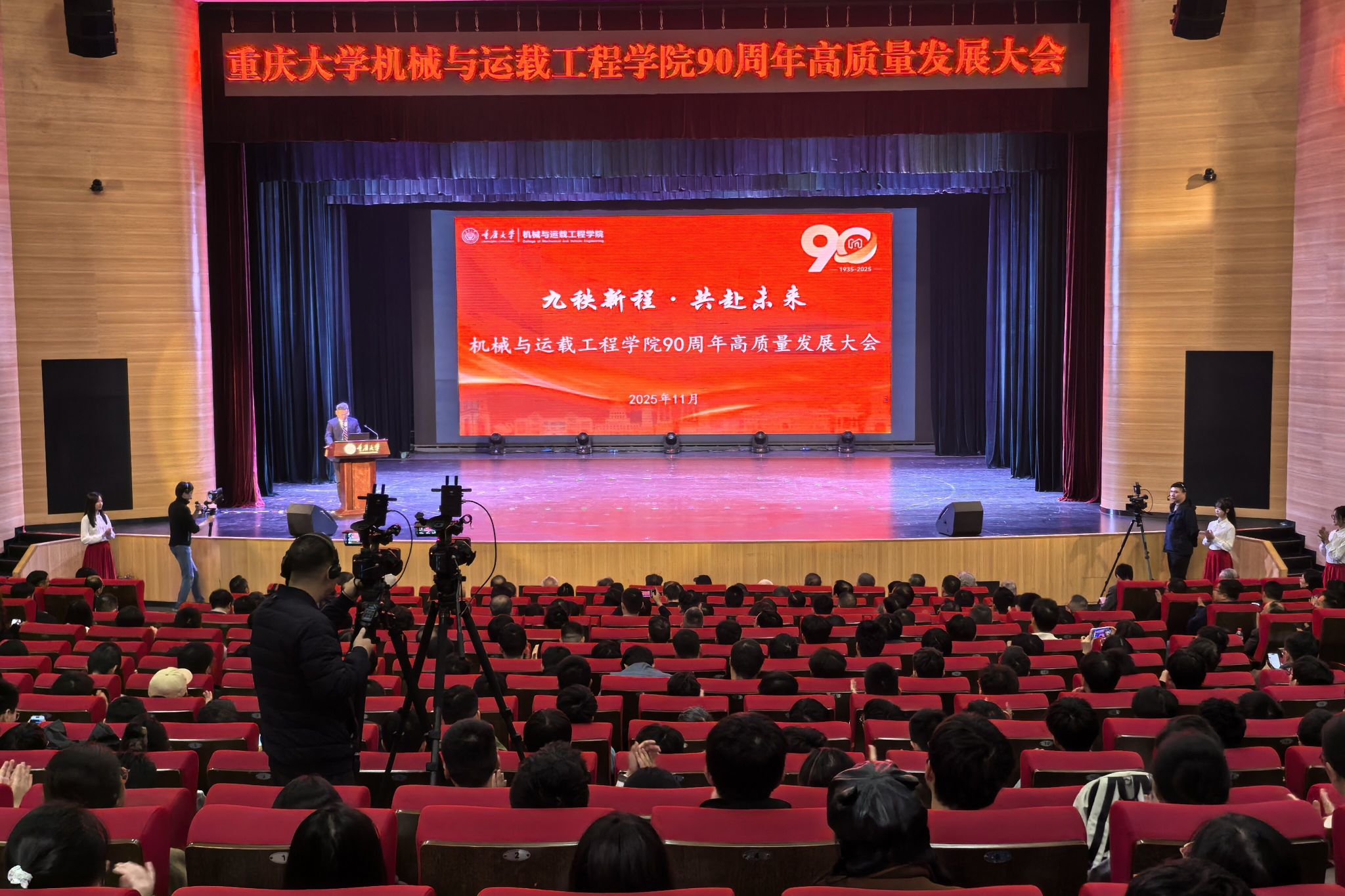 2025年11月2日上午,重庆大学机械与运载工程学院90周年高质量发展大会在沙坪坝校区B校园科学会堂举行。重庆大学党委书记王树新,党委常务副书记王时龙,重庆大学原研究生部主任徐宗俊,全国先进工作者、重庆大学原机械传动国家重点实验室学术委员会主任张光辉,重庆大学原汽车系主任何渝生,重庆大学原机械工程一系主任张济生,国家教学名师何玉林,重庆大学原党委书记欧可平,重庆大学原党委副书记、兰州大学、吉林大学原党委书记陈德文,重庆大学原副校长、广东工业大学、汕头大学原校长张湘伟,校友清华大学李克强院士等出席大会。北京、上海、广东、江苏、成都、深圳、东莞等各地分会校友代表,中国长安汽车集团有限公司、中冶赛迪集团有限公司等单位的校友代表及在校师生、离退休教师代表共500余人齐聚一堂,同庆华诞。海内外校友发来视频、贺信、贺电,恭贺母院九十华诞。大会由高端装备机械传动全国重点实验室常务副主任罗均主持。
